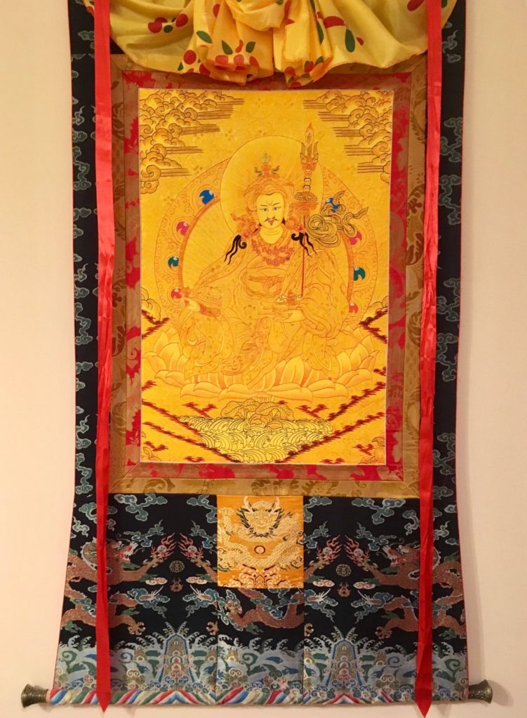 This very large gold Padmasambhava print from Tibet was hand selected by Pema Khandro Rinpoche during the Monkey Year Pilgrimage, carried back for her personal collection, and has been on display within the Meditation Hall at Khandro Ling Center in Virginia ever since.